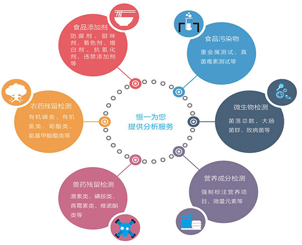 農藥殘留檢測、獸藥殘留檢測、微生物檢測、營養成分檢測、食品添加劑檢測、食品污染物檢測、農獸藥快速檢測等.